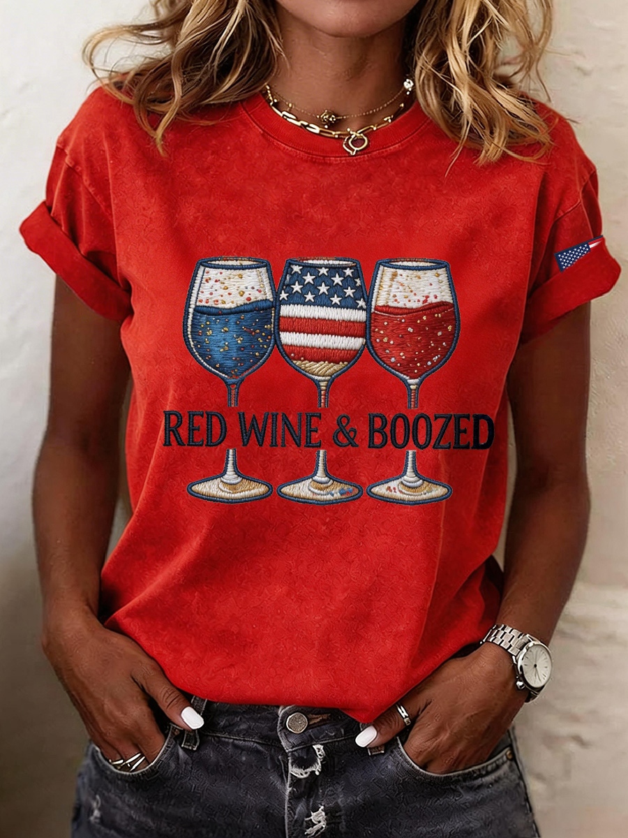 Women's Red Wine & Boozed Embroidery Pattern T-Shirt