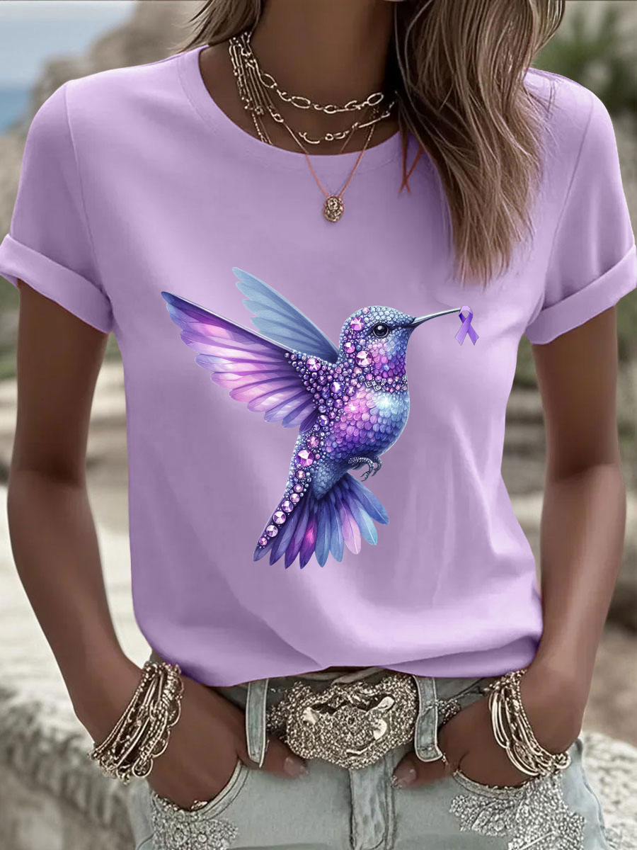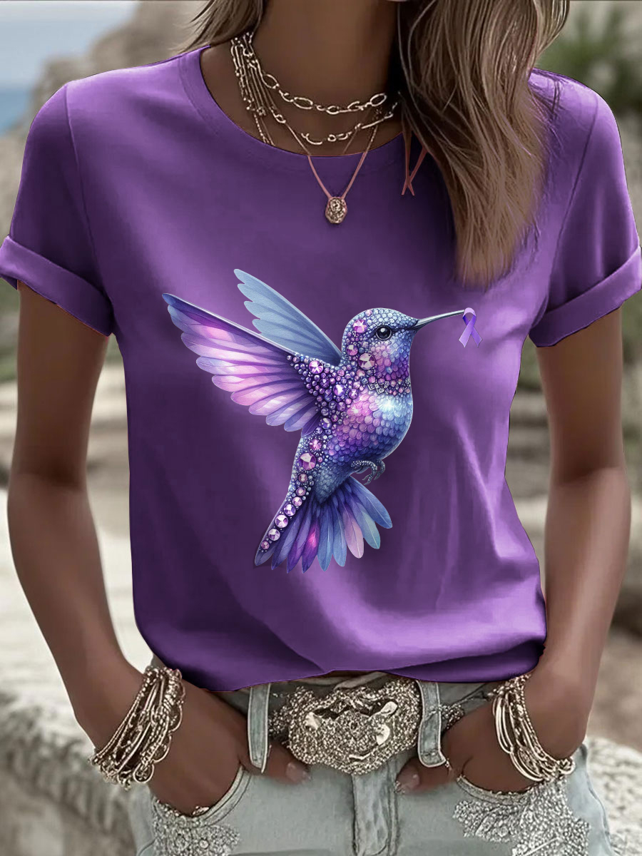 Women's Casual Alzheimer's Awareness Purple Hummingbird Print V-Neck Ribbed Top
