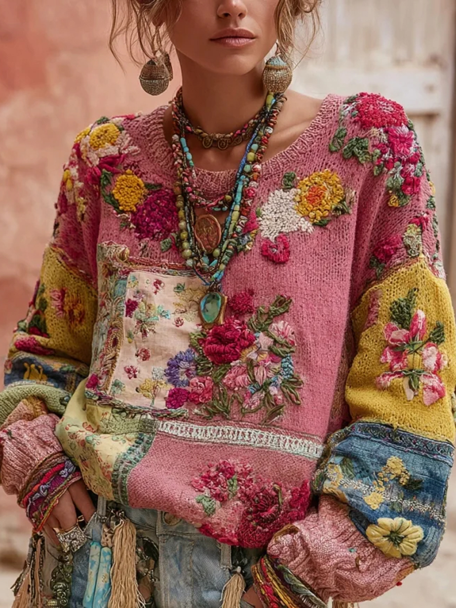 Women's Vintage Pink Flowers Colorblock Patchwork Sweatshirt