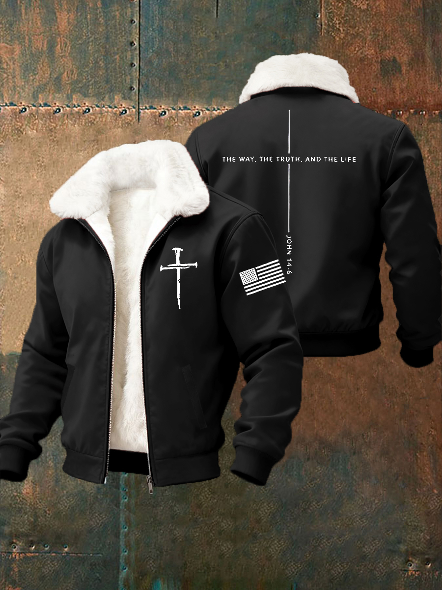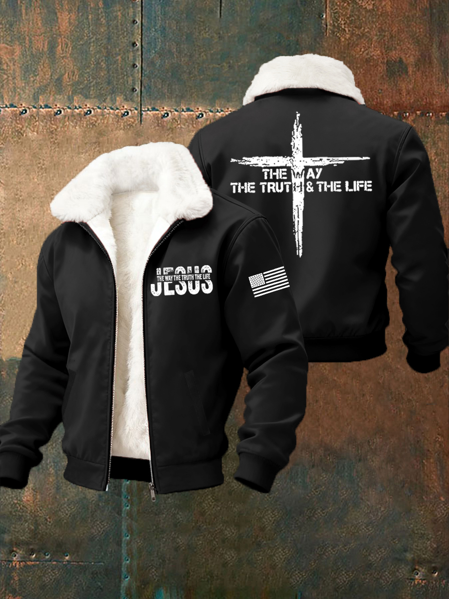 Men's Jesus The Way The Truth The Life Cross Fur Collar Zip-Up Jacket