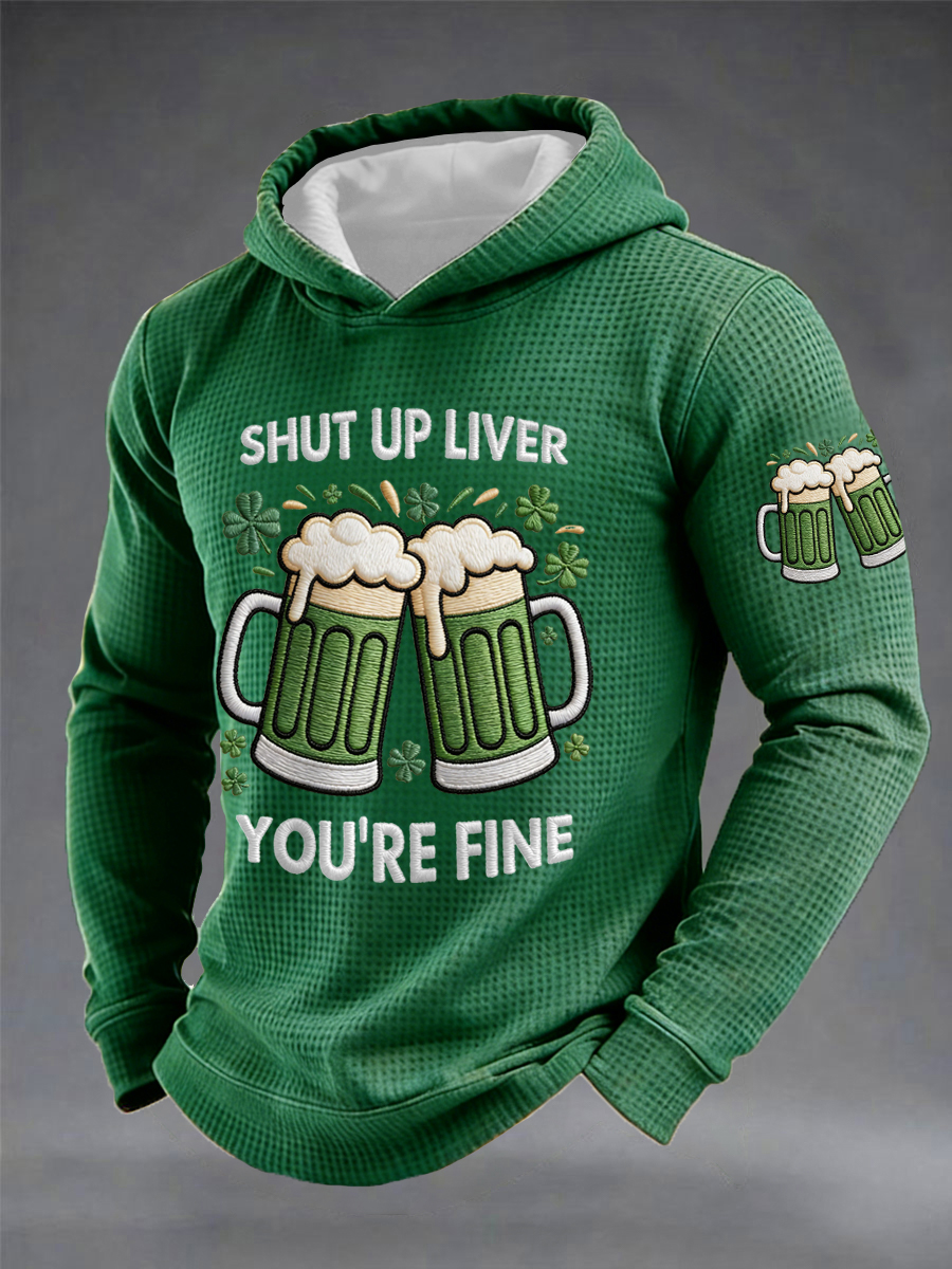 Men's Funny St. Patrick's Day Shut Up Liver You're Fine Green Beer Print Casual Waffle Hoodie